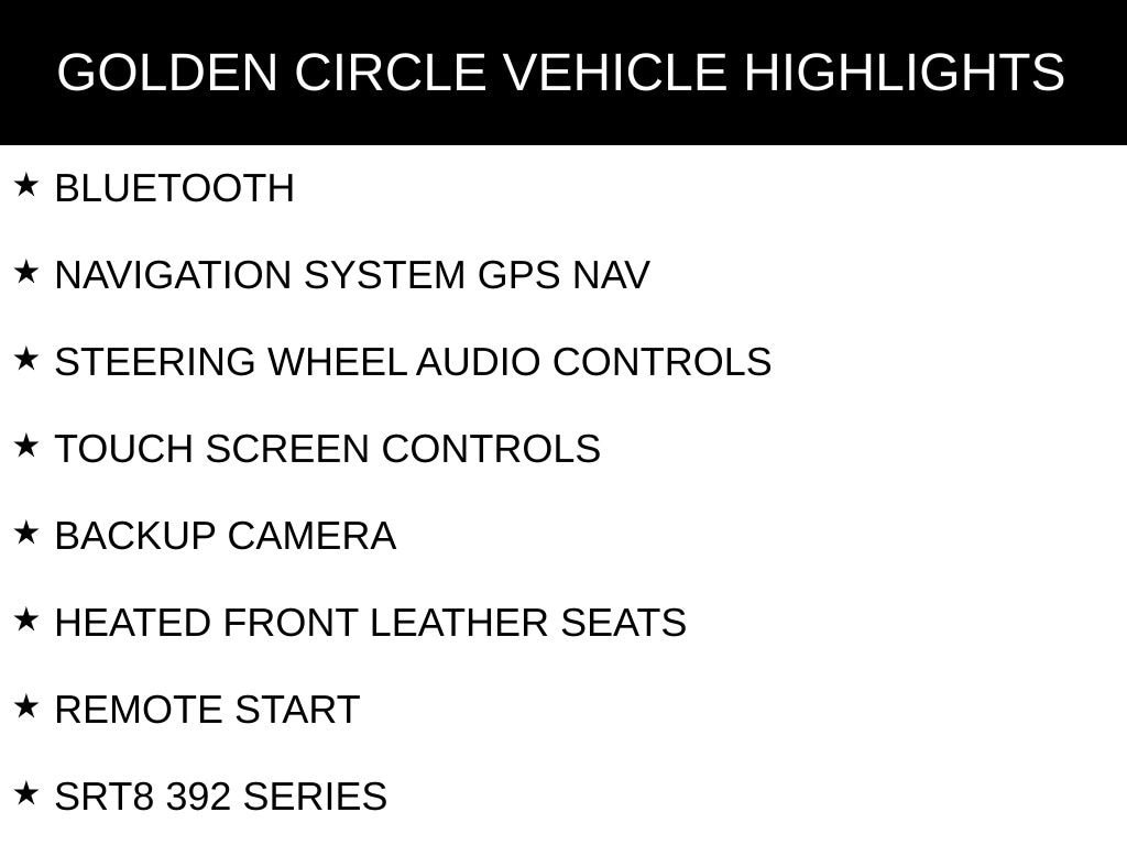 BLUETOOTH, NAVIGATION SYSTEM GPS NAV, STEERING WHEEL AUDIO CONTROLS, TOUCH SCREEN CONTROLS, BACKUP CAMERA, HEATED FRONT LEATHER SEATS, REMOTE START, SRT8 392 SERIES, MOPAR INTERIOR APPEARANCE PACAKGE, PREMIUM SOUND PACAKGE, QUICK ORDER PACKAGE 22W YELLOW JACKET, 20 PAINTED CAST ALUMINUM WHEELS, 18 SPEAKERS PREMIUM AUDIO SYSTEM, 900 WATT AMPLIFIER, AIR CONDITIONING, ANTI-WHIPLASH FRONT HEAD RESTRAINTS, AUTOMATIC TEMPERATURE CONTROL, BRAKE ASSIST, DELAY-OFF HEADLIGHTS, DRIVER DOOR BIN, DRIVER VANITY MIRROR, FOUR WHEEL INDEPENDENT SUSPENSION, FRONT FOG LIGHTS, HEATED DOOR MIRRORS, LEATHER SHIFT KNOB, LOW TIRE PRESSURE WARNING, MOPAR CAR COVER, OUTSIDE TEMPERATURE DISPLAY, OVERHEAD AIRBAG, OVERHEAD CONSOLE, PANIC ALARM, PASSENGER VANITY MIRROR, POWER DOOR MIRRORS, POWER WINDOWS, REAR WINDOW DEFROSTER, REMOTE KEYLESS ENTRY, SPEED CONTROL, SPEED-SENSING STEERING, TELESCOPING STEERING WHEEL, TILT STEERING WHEEL, VARIABLY INTERMITTENT WIPERS.