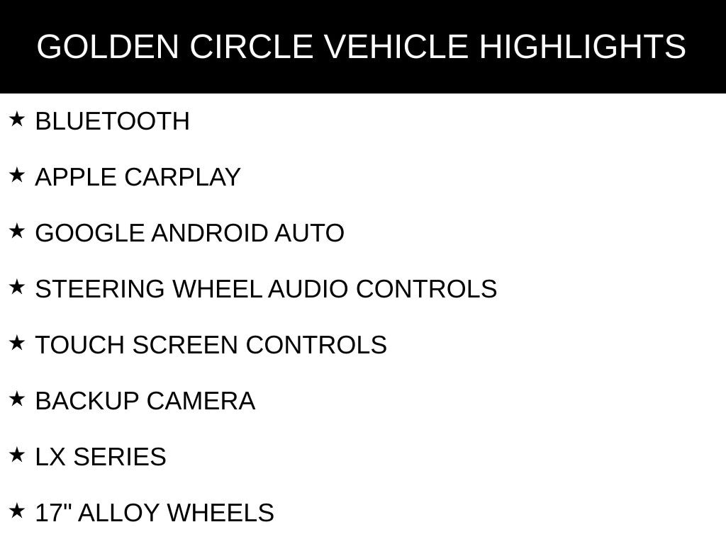 BLUETOOTH, APPLE CARPLAY, GOOGLE ANDROID AUTO, STEERING WHEEL AUDIO CONTROLS, TOUCH SCREEN CONTROLS, BACKUP CAMERA, LX SERIES, 17" ALLOY WHEELS, 6 SPEAKERS, AIR CONDITIONING, BRAKE ASSIST, CARGO NET (ENVELOPE), DELAY-OFF HEADLIGHTS, DRIVER VANITY MIRROR, DUAL FRONT IMPACT AIRBAGS, DUAL FRONT SIDE IMPACT AIRBAGS, FOUR WHEEL INDEPENDENT SUSPENSION, FULLY AUTOMATIC HEADLIGHTS, HEATED DOOR MIRRORS, LOW TIRE PRESSURE WARNING, OCCUPANT SENSING AIRBAG, OUTSIDE TEMPERATURE DISPLAY, OVERHEAD CONSOLE, PANIC ALARM, PASSENGER VANITY MIRROR, POWER DOOR MIRRORS, POWER STEERING, POWER WINDOWS, RADIO: AM/FM/MP3 AUDIO SYSTEM, REAR WINDOW DEFROSTER, REAR WINDOW WIPER, REMOTE KEYLESS ENTRY, SPEED CONTROL, SPEED-SENSING STEERING, SPLIT FOLDING REAR SEAT, TELESCOPING STEERING WHEEL, TILT STEERING WHEEL, TURN SIGNAL INDICATOR MIRRORS, VARIABLY INTERMITTENT WIPERS.