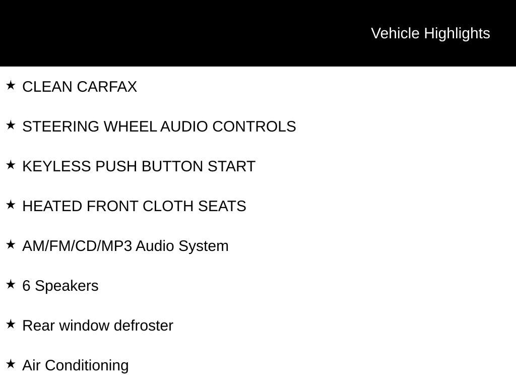 CLEAN CARFAX, STEERING WHEEL AUDIO CONTROLS, KEYLESS PUSH BUTTON START, HEATED FRONT CLOTH SEATS, 16 X 7.0 STEEL W/FULL COVERS WHEELS, 6 SPEAKERS, AIR CONDITIONING, AM/FM/CD/MP3 AUDIO SYSTEM, BRAKE ASSIST, DELAY-OFF HEADLIGHTS, DRIVER VANITY MIRROR, DUAL FRONT IMPACT AIRBAGS, DUAL FRONT SIDE IMPACT AIRBAGS, FOUR WHEEL INDEPENDENT SUSPENSION, FRONT READING LIGHTS, ILLUMINATED ENTRY, LOW TIRE PRESSURE WARNING, OCCUPANT SENSING AIRBAG, OUTSIDE TEMPERATURE DISPLAY, OVERHEAD CONSOLE, PANIC ALARM, PASSENGER VANITY MIRROR, POWER WINDOWS, REAR WINDOW DEFROSTER, REMOTE KEYLESS ENTRY, SECURITY SYSTEM, SPEED CONTROL, SPEED-SENSING STEERING, SPEED-SENSITIVE WIPERS, TELESCOPING STEERING WHEEL, TILT STEERING WHEEL, TRACTION CONTROL, VARIABLY INTERMITTENT WIPERS.